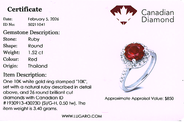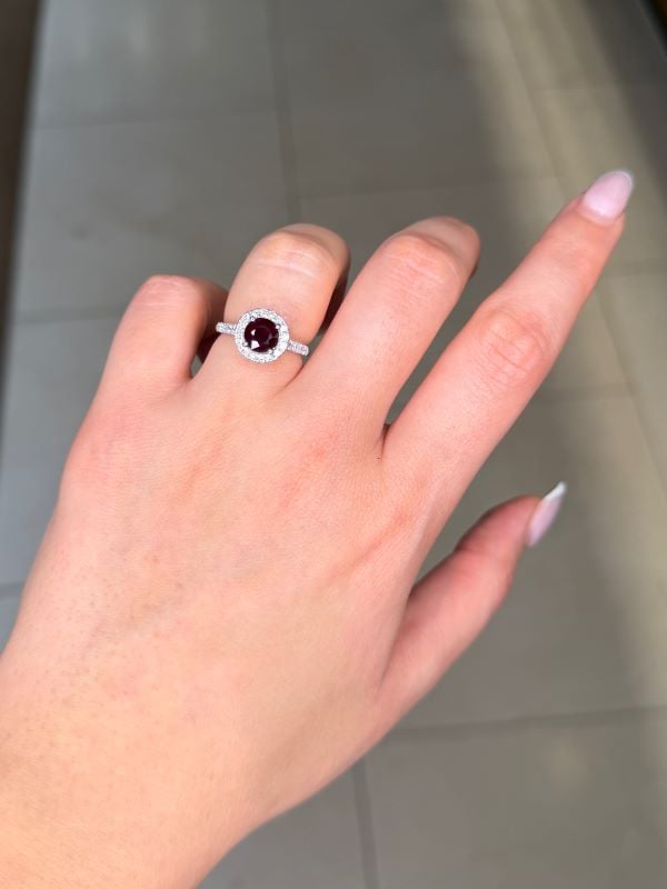Be the first to review “Thailand Origin 1.52 Carat Ruby and Canadian Diamond Halo Ring in 14K White Gold”