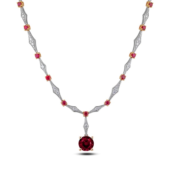 18K yellow and white gold necklace featuring a 2.12 carat round shaped ruby accented with 3.88 carat total weight round cut rubies and 1.78 carat total weight round brilliant cut diamonds.