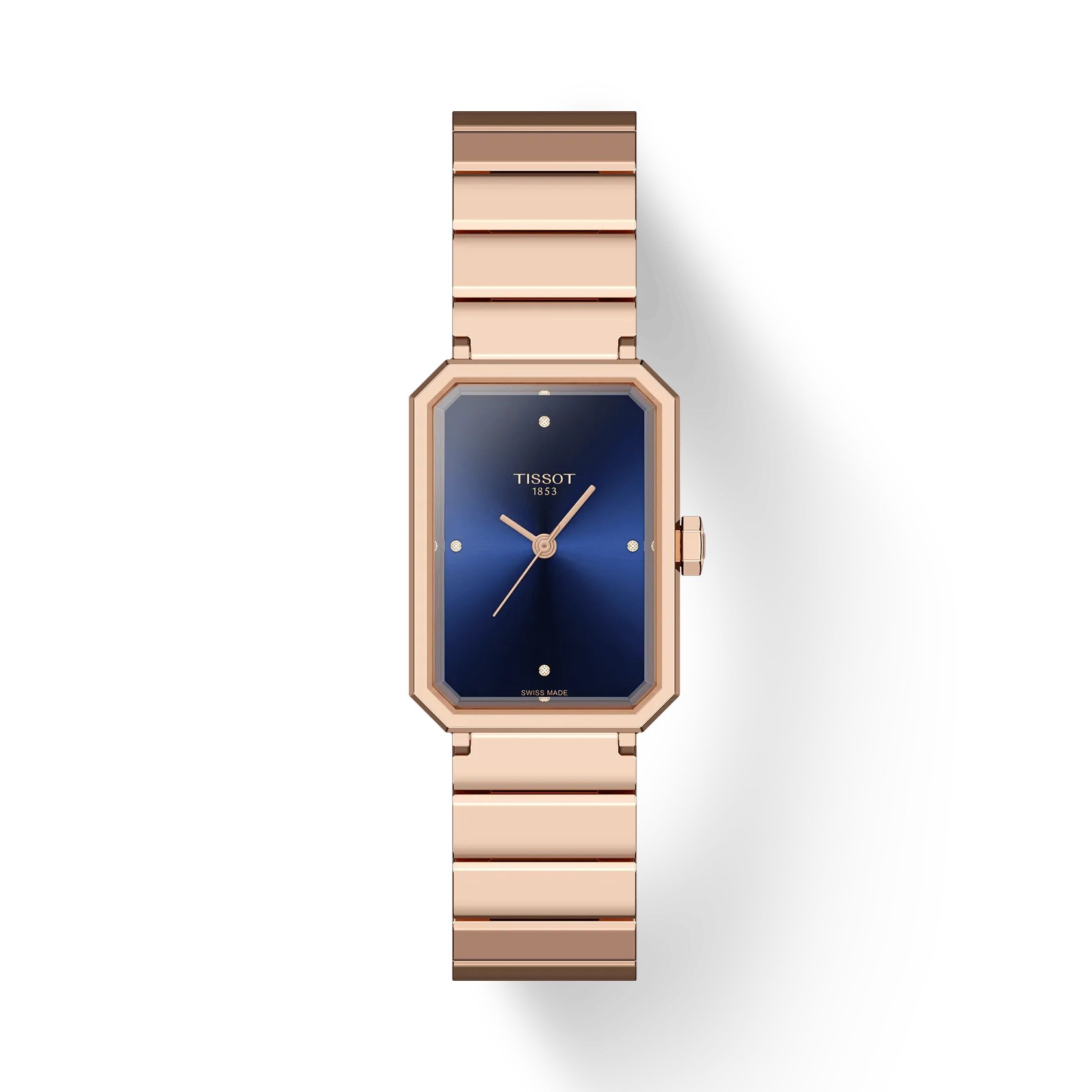 The SRV watch is inspired by the Art Deco times, developed in the 1920s. This time is characterised by geometric shapes and abstract patterns, become a dominant style in architecture, interior design, fashion and graphic arts. While the SRV is directly inspired by a model from 1975, that very design was itself a reinterpretation of Tissot’s earlier creations from the 1920s. The SRV’s quartz movement delivers precision that empowers to move forward fiercely and, with the End-of-Life indicator, the SRV anticipates her next move, so she’s always prepared. More than a name, SRV stands for, Sapphire Rectangle V: a faceted sapphire glass with a rectangular silhouette, and the ‘V’ a nod to its 5-bar water resistance, symbolised by the roman number 5. The metal bracelet is comfortable, robust, easy to clean and long-lasting. This rectangular watch with four diamonds on the dial will elevate your look and offer you confidence and comfort.