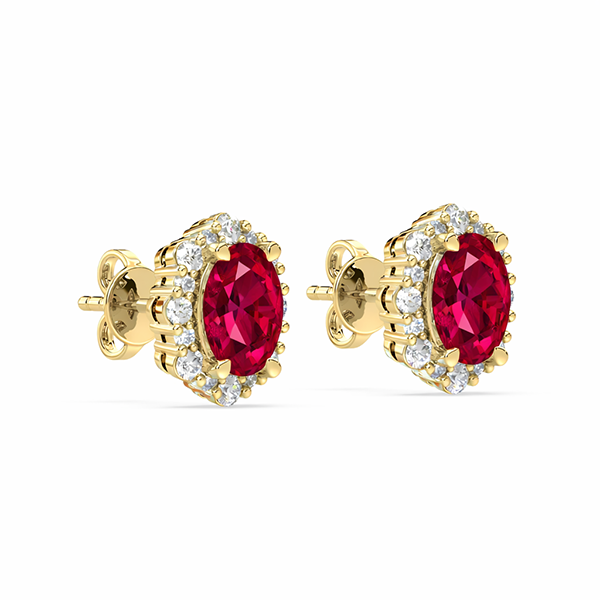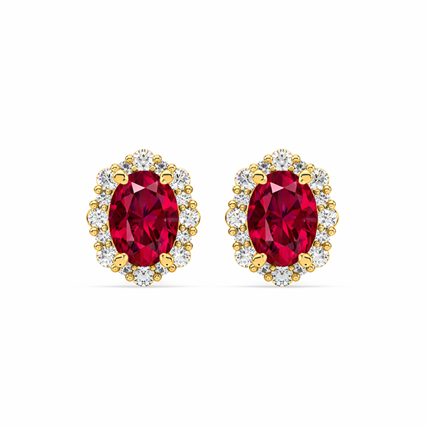 10K yellow gold halo earrings featuring a 2.18 carat total weight ruby, accented by 0.58 carat total weight round brilliant diamonds.