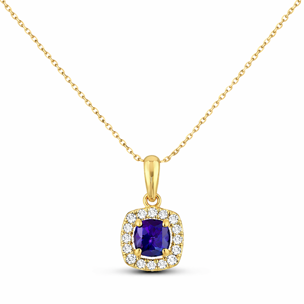 Violet Sapphire and Canadian Diamond Halo Pendant In Yellow Gold