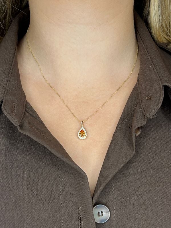 Be the first to review “Yellow Sapphire and Canadian Diamond Pear Shape Halo Pendant in Yellow Gold”